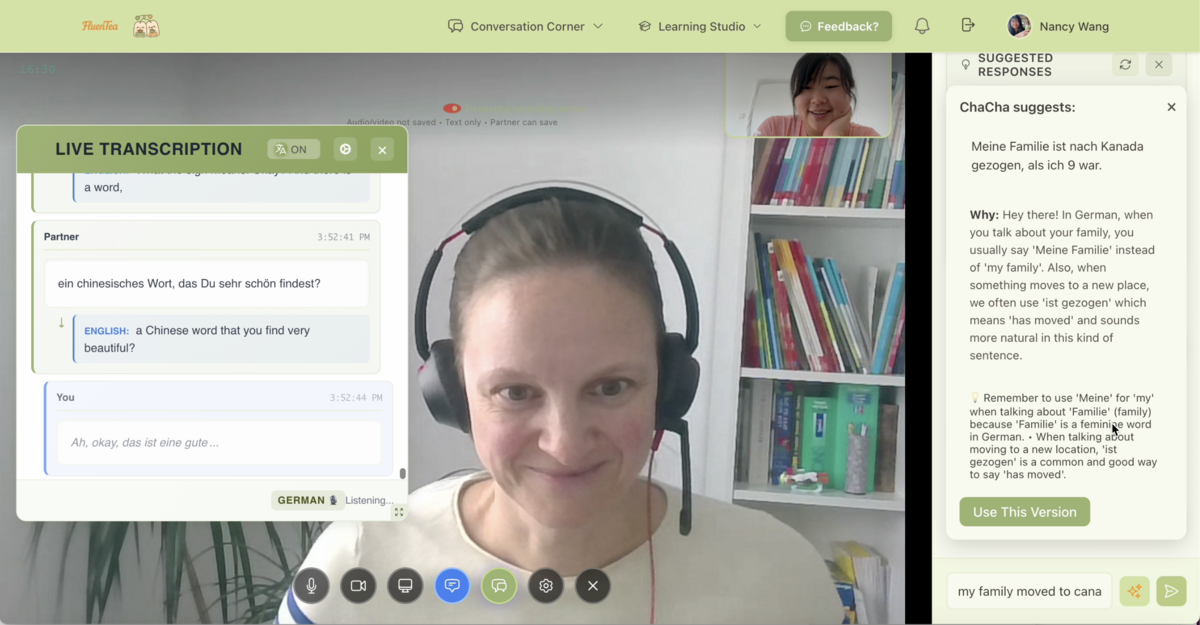 FluenTea connects you with real people to practice English, French, Spanish, Mandarin, and German. Our AI coach ChaCha supports you with feedback — without replacing authentic connection.